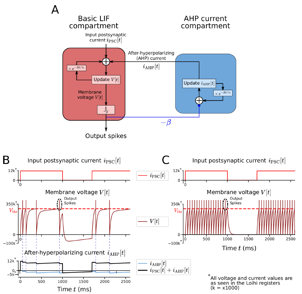 图 1. 两室AHP神经元的示意图和动力学。A) 两室神经元模型的示意图。第二个隔间为神经元的每个脉冲添加了一个非常缓慢衰减的AHP电流。每当神经元发放脉冲(即z(t) = 1)时,AHP电流(iAHP)变得更负一定量,并且在具有大时间常数τAHP的脉冲之间呈指数衰减。该电流与输入电流iPSC被积分以计算膜电压。这可以在Loihi上轻松实现。由神经元的外部输入引起的突触后电流(PSC) iPSC[t]和AHP电流被泄漏集成到膜电压V[t]中。每次电压超过发放阈值Vthr时,都会发出脉冲信号并重置V[t]。B) AHP神经元对作为输入的两个当前步骤序列的响应。可以看到AHP电流(蓝色迹)如何叠加,并减少发放。注意它对两个输入电流阶跃响应的不同。它显示出清晰的记忆效应。C) 标准LIF神经元模型对相同输入电流的响应。此处,A中用于AHP电流的第二个隔间已被移除。人们看到这个神经元以更高的恒定发放率发放,并且对第二个电流步骤的响应方式与对第一个步骤完全相同。