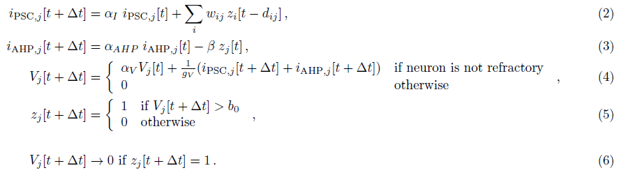 LIF神经元和具有后超极化(AHP)电流(由 j 索引)的AHP神经元的动力学行为,如在Loihi中实现的,由公式3-6给出。在此,我们展示了时间 t 处输入脉冲之间的动态相互作用,由此产生的输入突触后电流(PSC) iPSC,j[t]、内部AHP电流iAHP,j[t]、膜电压Vj[t]和输出脉冲zj[t + 1]。公式随后解释为:
