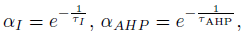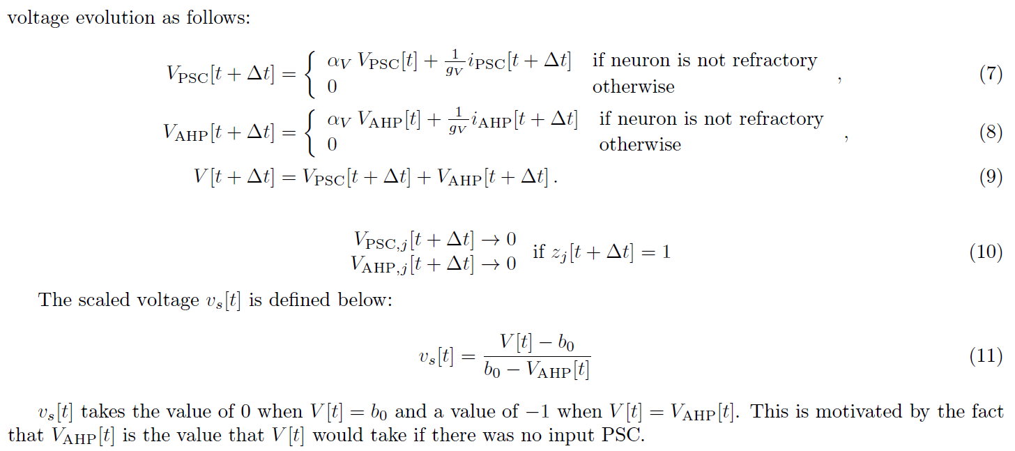 ,其中τI、τAHP和τV是相应指数的衰减常数。β是响应输出脉冲对AHP电流的更新。由于状态转换是在Loihi中计算的,因此我们将单个计算步骤与1ms生物时间相关联,相应地Δt = 1ms和gV = 1。
