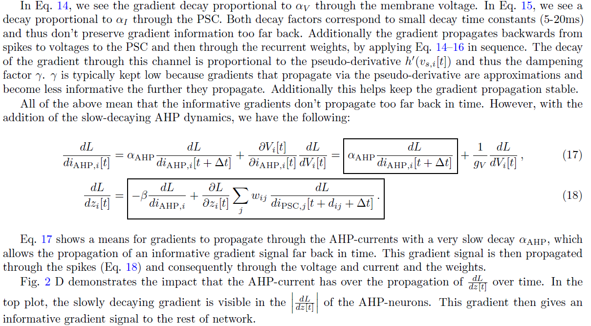 公式3定义了AHP电流。当β > 0时,每个输出脉冲即zj[t] > 0将导致iAHP,j[t]变得更负值。当泄漏集成到膜电压V[t](公式4)中时,iAHP[t]的负值增加会降低后续脉冲的发放率,从而导致脉冲频率适应。AHP电流的衰减时间常数τAHP比τV和τI长得多,通常 > 100ms。缓慢衰减意味着这种抑制会持续更长的时间,从而起到长期记忆细胞的作用。这种更持久的记忆被证明对于解决这项工作中展示的复杂任务是无价的。