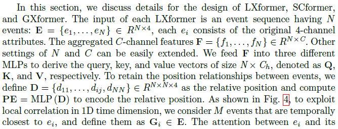 图3a描绘了由四个Event Transformer Blocks (ETB) 组成的Event Transformer主干,以在输出特征的多级方式中有效地表征来自输入事件序列的时空相关性。如图3b所示,每个ETB由三个串联互连的模块组成:local transformer (LXformer)、sparse conformer (SCformer)和global transformer (GXformer)。