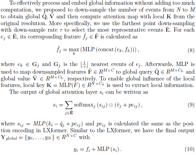 LXformer和SCformer在空间和时间维度上聚合局部特征。具体来说,LXformer只允许使用M个时间最接近的事件,而SCformer中的感受野仅限于窗口Wi。然而,对于高层次的视觉任务,所有事件的全局关系尤为重要。如果我们直接将LXformer中的M个事件扩大到所有事件,计算复杂度将从N增加到N2,这对于大N可能变得不可行。
