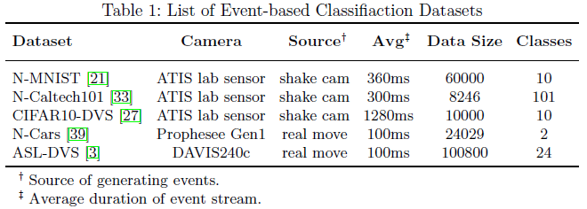 Datasets and metrics. 我们在五个基于事件的分类数据集上测试我们的模型:N-MNIST [21]、N-Caltech101 [33]、CIFAR10-DVS [27]、N-Cars [39]和ASL-DVS [3]。如表1所示,这些数据集在捕获的相机、事件源、事件流的平均持续时间和数据集大小方面差异很大。N-MNIST、N-Caltech101和CIFAR10-DVS是使用实验室版本的事件相机(基于异步时间的图像传感器实验室传感器)拍摄的。