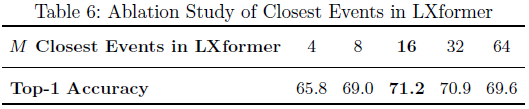 Number of closest events in LXformer. 在LXformer中,我们将每个事件与在时间序列中与其相邻发生的M个事件进行交互,这里我们试验最近事件的数量。表6显示,当最近事件的数量较少(M = 4或M = 8)时,LXformer无法提取足够的内容信息(性能分别下降-5.4和-1.2)。当数字非常大时(M = 32或M = 64),它会引入过多的噪声事件并导致注意力损失(性能分别下降-0.3和-1.6)。