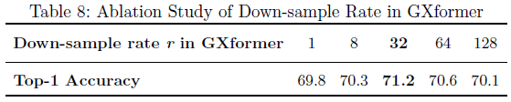Down-sample rate in GXformer. 最后,我们评估了GXformer中下采样率 r 对模型性能的影响。如表8所示,当下采样率 r 为1时,即没有下采样,GXformer退化为LXformer。实验结果表明,当 r 较小时(1和8),提取的全局信息不全面(-1.4和-0.9)。而当 r 太大(64和128)时,会导致信息丢失过多(-0.6和-1.1)。因此,我们最终选择了32的下采样率。