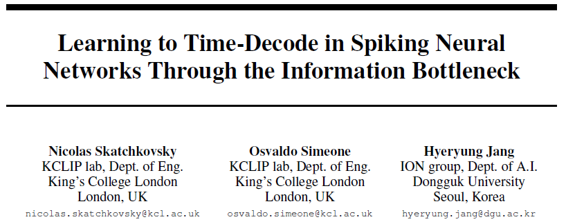 Information bottleneck. IB技术起源于二十年前[8],在假设离散变量的率失真问题形成的背景下。近年来,该方法重新引起了人们的兴趣,首先是作为解释ANN性能的手段[18],然后是[9]中的训练标准。我们通过考虑因果关系约束下的时间信号来扩展IB,从而用有向信息代替相互信息[10]。IB原理先前已在SNN文献中用于单个神经元的情况[19, 20]。最后,它已在理论神经科学中用于解释感觉神经元的处理[21],并作为预测和有效编码理论的统一原则。我们的模型包含[21]中介绍的框架。