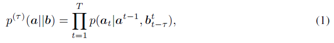 ;该分布(1)捕获序列a对b的最后τ样本的因果依赖性。如果τ=T,我们恢复因果条件分布[10]。