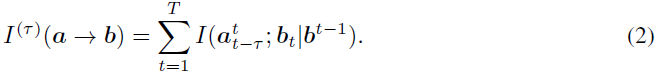 该度量量化了从序列a到b的最后τ样本的因果统计相关性。当τ=T时,这将恢复标准定向信息[10]。我们表示为卷积算子
