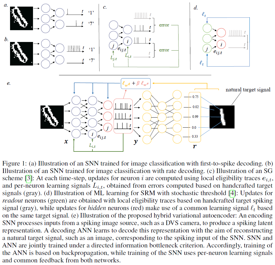 Problem definition. 我们研究了图1中的混合SNN-ANN自动编码器架构,目的是训练SNN编码器以产生脉冲输入x的时间编码脉冲表示y,该脉冲表示y是关于自然参考信号r的信息。在整个过程中,脉冲信号是二值矢量序列,其中“1”表示脉冲,而自然信号是实值矢量序列。在图1(e)中的原型应用中,输入x从神经形态传感器(如DVS摄像机[5])获得,参考信号r表示相应的目标自然信号,如标签或原始自然图像。SNN产生的脉冲表示y被馈送到ANN,其作用是将y解码为参考信号r。重要的是,我们没有先验地约束解码策略。相比之下,现有的工作通常手工制作对应于某些固定解码规则的目标脉冲信号y,例如发放率解码(图1(a)-(b))。我们的主要贡献是一种联合训练编码SNN和解码ANN的方法,目的是从编码SNN产生的脉冲信号中发现自动有效的时间解码规则。