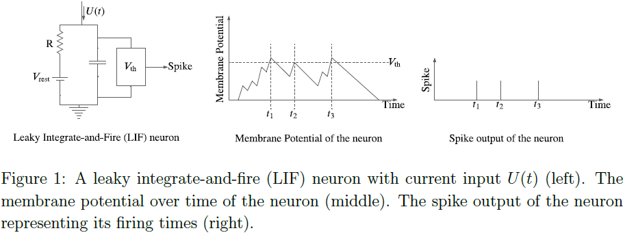 在SNN中,神经元通过突触连接。神经元可以被实现为IF逻辑[8],如图1(左)所示。这里,来自突触前神经元的输入当前脉冲U(t)提高了突触后神经元的膜电压。当该电压超过阈值Vth时,IF逻辑发出一个脉冲,该脉冲传播到突触后神经元。图1(中)说明了输入脉冲序列引起的膜电压。图1(右)显示了超过阈值的时刻,即发放时间。