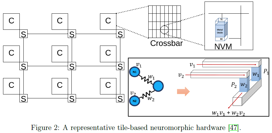 图2显示了具有瓦片(C)和开关(S)的神经形态硬件。为了说明的目的,我们将每个瓦片显示为交叉(crossbar),其中NVM单元组织在使用水平字线和垂直位线形成的二维网格中。