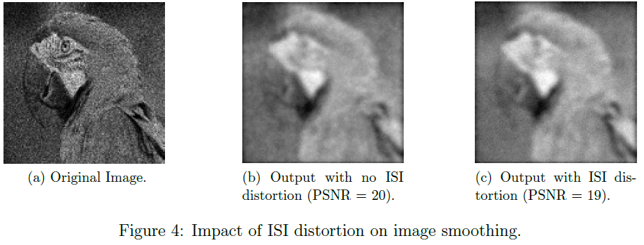 图4显示了ISI失真在应用程序级别的影响。我们考虑使用CARLsim模拟器使用SNN模型实现的图像平滑应用[67]。图4a显示了输入图像,该图像被馈送到SNN。图4b显示了无ISI失真的图像平滑应用程序的输出。输出相对于输入的峰值信噪比(PSNR)为20。图4c显示了ISI失真的输出。该输出的PSNR为19。PSNR的降低表明具有ISI失真的输出图像质量更低。