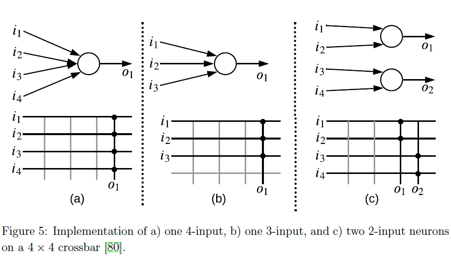 在实现方面,用于神经形态硬件的系统软件还必须包含硬件约束,例如受限的神经结构、有限的神经元和突触容量以及每个神经元的有限扇入。我们采用交叉的架构[71, 72, 73, 74, 75, 76, 77, 78, 79],这通常用于实现神经形态硬件平台。在交叉中,位线和字线被组织成网格,存储单元在其交叉点连接以存储突触权重。神经元电路沿着位线和字线实现。每个突触后神经元的交叉只能容纳有限数量的突触前连接。为了说明这一点,图5显示了在4×4交叉上实现神经元的三个示例。左子图显示了在交叉上实现四输入神经元的情况。神经元占据了所有四个输入端口和一个输出端口。中间的子图显示了一个三输入神经元的实现,占据了三个输入端口,一个输出端口。最后,右侧的子图展示了两个两输入神经元的实施,占据了四个输入端口和两个输出端口。