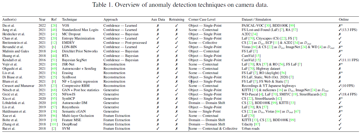 自动驾驶汽车通常配备不同的摄像头系统,如立体声、单声道和鱼眼摄像头,以确保对环境的丰富感知。因此,摄像机数据中的异常检测具有更强大的视觉感知的巨大潜力。在本节中,我们将根据Fishyscapes(FS)基准[31]引入另外两个标准:辅助数据和重训练。前者表示一种方法在训练过程中是否需要异常数据。然而,重训练规定了方法是否不能使用预训练的模型,而是需要特殊的损失或重新训练,这可能会降低性能[31]。表1中列出了所有基于相机的方法。