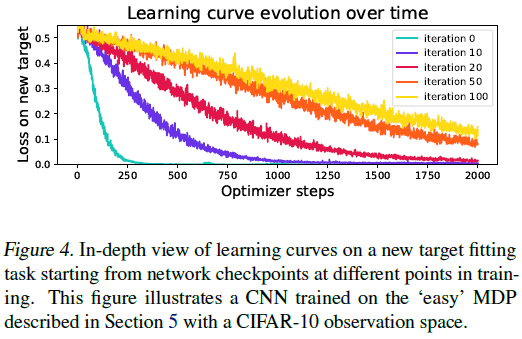 本文的研究结果突出了课程学习和基础模型的研究之间的分歧,基础模型确定了合适的早期训练目标,以加速学习并提高后期任务的泛化能力,而我们已经发现的关于非平稳预测问题中可塑性损失的现象。然而,随着强化学习算法扩展到更复杂的任务,这些机制之间的差距缩小了。虽然在许多情况下,可塑性损失可能不是网络性能的限制因素,因此对于今天用于基准测试算法的许多相对较小的环境来说不必担心,但我们推测,随着我们应用RL的任务的复杂性的增加,保持可塑性的重要性也会增加。