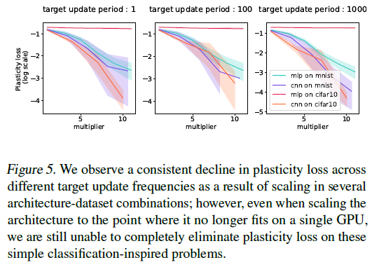 在考虑解决可塑性损失的复杂方法之前,我们必须首先回答这样一个问题,即这是否只是小型网络的一种疾病。在大型模型取得令人印象深刻的成功和由此产生的“比例定律”现象的背景下(Kaplan et al.,2020),可塑性损失和许多其他挑战一样,在无限计算的极限下消失是完全合理的。我们发现,虽然在小型网络中,可塑性损失最容易以极端形式诱发,但将CNN扩展到单个GPU内存的极限,即使在上一节中描述的简单分类任务中,也不足以消除可塑性损失。我们在图5中可视化了网络宽度和可塑性损失之间的关系。