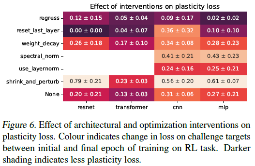在本节中,我们评估了各种干预措施对可塑性丧失的影响。我们评估了第4.1节中使用的相同任务的干预措施,即1000步的100次迭代训练。我们考虑了四种架构:多层感知器(MLP)、无跳过连接的卷积神经网络(CNN)、ResNet-18(He et al.,2016)和基于ViT架构的小型转换器(Dosovitskiy et al.,2020)。