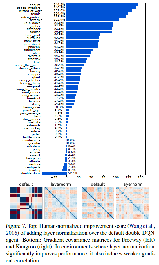 我们在图7中看到,层归一化的引入有力地提高了整个基准测试的性能。我们强调,我们没有执行任何优化器或其他超参数调整。虽然这种改进不能完全归因于所提供的证据中塑性损失的减少,但它指出优化景观的正则化是朝着更稳健的RL智能体方向发展的一个富有成效的方向。我们进一步观察到,层归一化显著提高性能的许多环境是默认架构的梯度协方差结构退化或Hessian病态的环境,并且获得性能改进的LN网络往往具有相应更好的梯度和Hessian结构。我们在图7中对这一现象进行了提示,并将对所有57个游戏的完整评估推迟到附录B.3中。