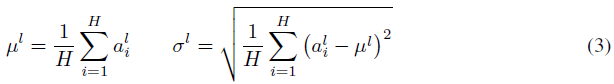 其中H表示层中隐藏单元的数量。公式(2)和公式(3)之间的区别在于,在层归一化下,层中的所有隐藏单元共享相同的归一化项,但不同的训练情况具有不同的归一化项。与批量归一化不同,层归一化不会对小批量的大小施加任何约束,并且可以在批量大小为1的纯在线状态下使用。