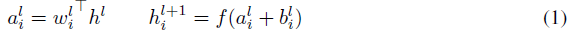 前馈神经网络是从输入模式x到输出向量y的非线性映射。考虑深度前馈神经网络中的第 l 个隐藏层,并假设al是该层中神经元的总输入的向量表示。通过线性投影计算求和输入,权重矩阵Wl和自下而上的输入hl如下所示: