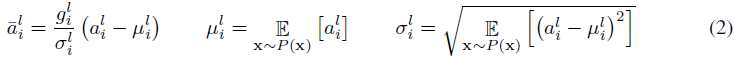是到第 l 层中的第 i 个隐藏单元的归一化求和输入,gi是在非线性激活函数之前缩放归一化激活的增益参数。请注意,期望值是在整个训练数据分布下。精确计算公式(2)中的期望值通常是不切实际的,因为这需要通过具有当前权重集的整个训练数据集进行前向传递。相反,μ和σ使用当前小批量的经验样本进行估计。这限制了小批量的大小,并且很难应用于循环神经网络。
