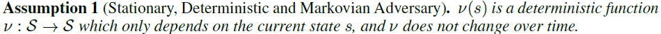 这一假设适用于许多对抗性攻击[27,36,31,50]。这些攻击只依赖于当前状态输入和策略或Q网络,因此它们是马尔可夫的;网络参数在测试时被冻结,因此给定相同的s,对手将产生相同的(静止的)扰动。我们把对非马尔可夫且非平稳对手的正式分析留给未来的工作。