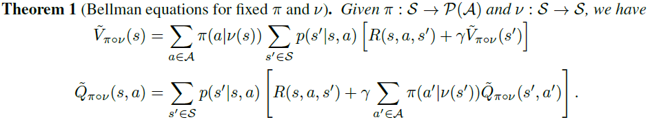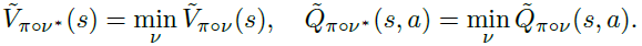 定理1的证明很简单,比如当π, v是固定的,可以将它们“合并”为单个策略,并且可以直接应用MDP的现有结果。现在我们考虑一个更复杂的情况,我们想找到最优对手v*(π)下的价值函数,使固定目标的总期望奖励最小化。最优对抗性价值和动作-价值函数被定义为: