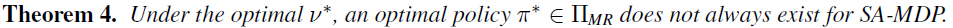 证明是通过构建一个反例来完成的,其中一些随机策略比SA-MDP中的任何其他确定性策略都要好(见附录A)。相反,在MDP中,对于任何随机策略,我们都可以找到一个至少与随机策略一样好的确定性策略。不幸的是,即使同时寻找确定性和随机性策略,也无法始终找到最优策略: