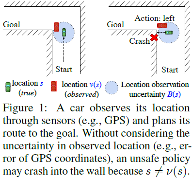 当RL智能体通过观测获得其当前状态时,观测可能包含不确定性,这种不确定性自然源于不可避免的传感器错误或设备不准确。对这种不确定性不鲁棒的策略可能会导致灾难性故障(例如,图1中的导航设置)。为了确保在最坏情况下的不确定性下的安全性,我们考虑对抗性设置,其中状态观测从s到ν(s)受到对抗性扰动,但潜在的真实环境状态s不变。这种设置与许多对状态观测的对抗性攻击一致(例如,[27,36]),并且不能用现有的工具(如部分可观测马尔可夫决策过程(POMDP))来表征,因为POMDP中的条件观测概率不能捕捉对抗性(最坏情况)场景。在这种情况下研究基本原则至关重要。
