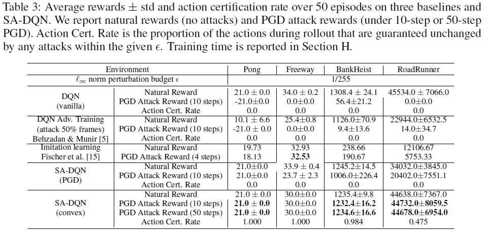 我们在表3中报告了SA-DQN的鲁棒性证书。如E节所述,对于DQN,我们可以保证动作在有界对抗性噪声下不会改变。在表3中,“动作认证率”是在任何l∞范数有界噪声下不改变的动作的比率。在某些设置中,我们发现100%的动作保证不变(例如,表3中的Pong环境)。在这种情况下,我们实际上也可以证明,在特定的测试初始条件下,累积奖励没有改变。