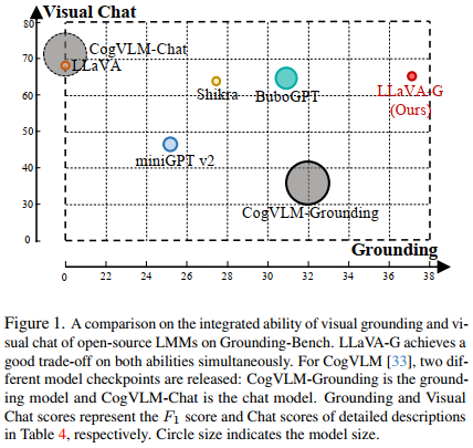 认识到视觉定位对LMM的重要性,最近的研究工作集中在开发LMM的定位和引用能力[2, 3, 10, 33, 40]。虽然这些模型在RefCOCO [8]和Flickr30K [29]等经典定位基准上实现了与专业模型[19, 21]相当的性能,但它们通常将定位视为一项独特的任务,需要自定义提示词才能启动。因此,当被赋予定位任务时,他们的文本响应会发生重大变化。大多数模型,如MiniGPT-v2 [2]和CogVLM-Grounding [33],在执行定位时只能生成短说明文字,因为它们主要基于Flickr30K等定位说明文字数据进行训练。如图1所示,这些早期的模型很难同时在聊天和定位任务中表现出色。BuboGPT [47]通过利用外部定位模型进行定位来保持聊天功能,但这种方法可能会受到定位模型中语言编码器性能的限制。Shikra [3]参与引用对话,其中包括定位聊天,但由于可用数据的稀缺,其性能受到限制。所有现有的LMM [2, 3, 33, 40]都只支持将坐标输出为文本,这限制了定位性能,并且不支持逐像素的定位和引用。总之,由于缺乏定位的视觉聊天数据和次优的模型设计,以前的LMM很难有效地执行定位的可视化聊天。此外,它们缺乏像素定位和引用的能力。