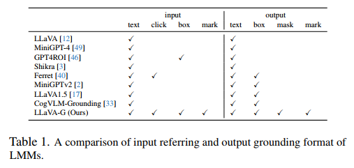 - 我们提出了一个端到端模型,简称LLaVA-Grounding(简称LLaVA-G),它将LMM与定位模型连接起来,以促进定位视觉聊天。我们的模型支持目标级和像素级定位,可以适应各种视觉提示词,如标记、点击、框和涂鸦。表1指出,与其他LMM相比,我们的模型提供了更广泛的输入和输出提示词类型。