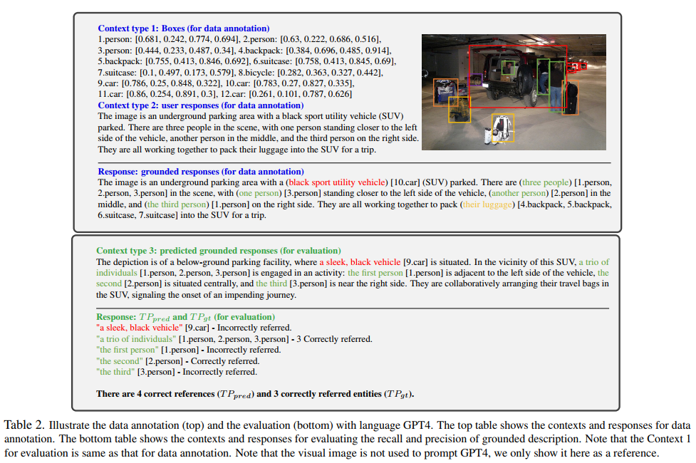 我们的数据标注过程旨在将对话中的短语与特定实例相关联。为了实现这一点,我们利用了GPT-4的功能。如表2所示,我们为GPT-4提供了包含类标签和对话中的一句话的基本事实(GT)框。我们让GPT-4从句子中匹配名词短语到GT实例。一旦名词短语被GPT-4成功地定位,我们就用特殊的开始token ⟨gs⟩和⟨ge⟩来标记它们,后面跟着一个token ⟨seg⟩,它对应于定位模型用于分割定位区域的输出特征。数据集中的问题及其答案示例如下: