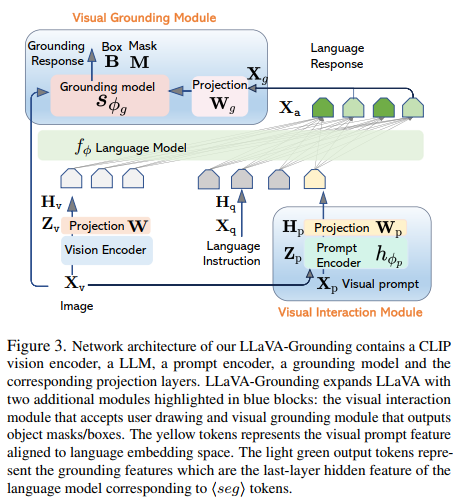 由于我们的网络架构与LLaVA几乎相同,除了额外的提示词编码器和定位模型外,我们将在本节中仅介绍这两个部分。有关我们架构的其他组件,请参阅LLaVA [18]。
