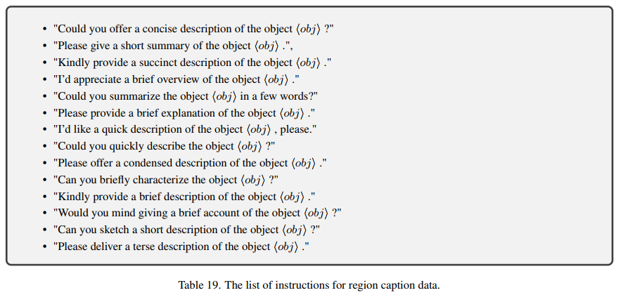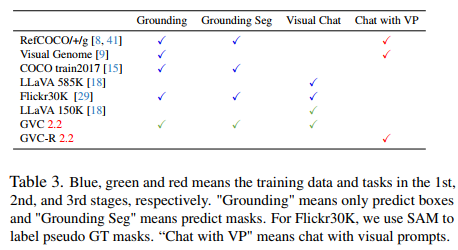 阶段3:视觉提示词的拓展。在第三个阶段,我们引入了对视觉提示词的支持,作为一个额外的组成部分,通过仅训练hΦ和投影层Wp。如表3所示,训练数据包括RefCOCO/+/g、Visual Genome和GVC-R。与阶段1相比,对于RefCOCO/+/g和Visual Genome,我们为基本事实实例提供视觉提示词,并指示模型预测说明文字。文本指令Xp是从表19中随机选择的,其中⟨obj⟩ token用作占位符,它们的输入嵌入将被提示词特征取代。文本答案Xa包括原始引用表达式。