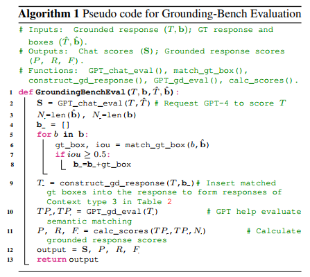 评估聊天分数。我们的基准评估包括两个主要方面:聊天分数和定位响应分数。我们概述了算法1中Grounding-Bench的评估过程。聊天分数与LLaVA-Bench中使用的分数相似。然而,相反,我们指示模型产生定位响应。随后,我们处理输出以删除特殊的token和框,从而生成纯文本响应以进行评估。