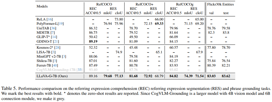 我们还根据经典的定位基准来评估我们的模型,包括用于引用表达理解(REC)和引用表达分割(RES)的RefCOCO/+/g,以及用于短语定位的Flickr30K Entities。对于这个实验,我们使用7B语言模型和使用Swin-Tiny主干的定位模型。我们的模型在第一个阶段使用RefCOCO/+/g、Visual Genome和Flickr30K Entities进行训练。我们的模型是唯一一个在REC和RES任务中都表现出色的LMM。在REC任务中,我们的模型优于所有LMM,除了CogVLM-Grounding,它使用了4B视觉模型和6B连接模块。在RES和短语定位任务方面,我们的模型超越了所有LMM。我们的模型的一个优势是它能够在框和掩码数据上进行训练,使我们能够利用Visual Genome来提高我们的RES性能。