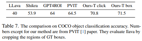 支持点击和框作为视觉提示词。为了进一步证明我们对视觉提示词的支持,我们在表7中比较了COCO val2017的目标分类准确性。我们使用点击和框作为视觉提示词来报告我们的表现。此外,我们还包括PVIT文件中的数字供参考。结果表明,我们的引用准确度超过了以前的作品,框比点击产生更好的准确度。