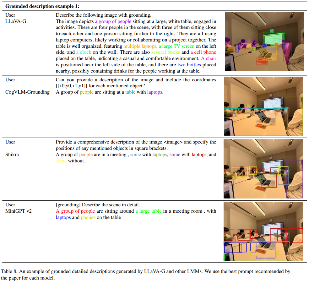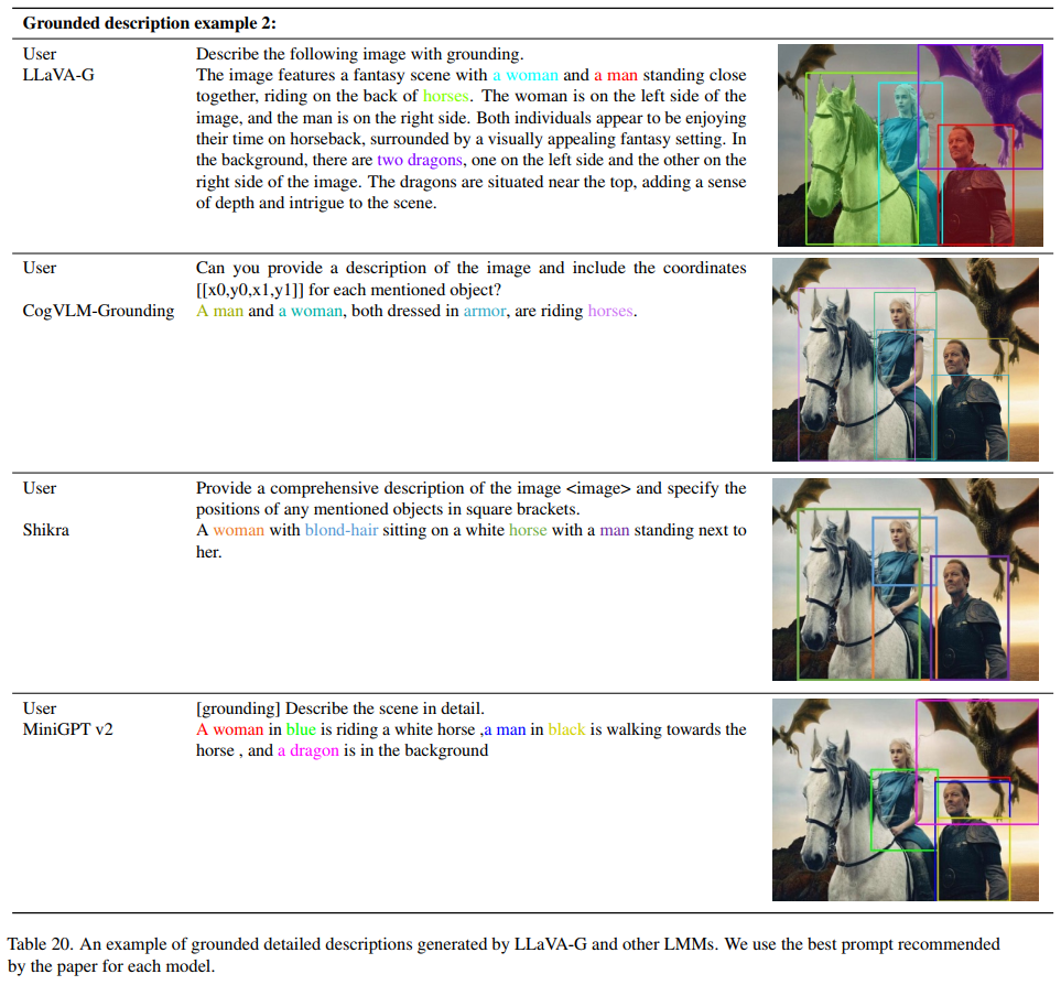 与其他模型进行比较。我们在表8、20和21中提供了我们的模型与其他定位LMM之间的视觉比较,包括CogVLM-Grounding、Shikra和MiniGPTv2。这些可视化突出表明,我们的模型生成更长的描述,检测更多的目标,并保持高精度。此外,我们的模型展示了建立开放集概念的能力,例如"dragons",而这些概念在我们的定位视觉聊天数据中并不存在。这些视觉比较强调了我们的模型在定位视觉聊天环境中的优势和能力。