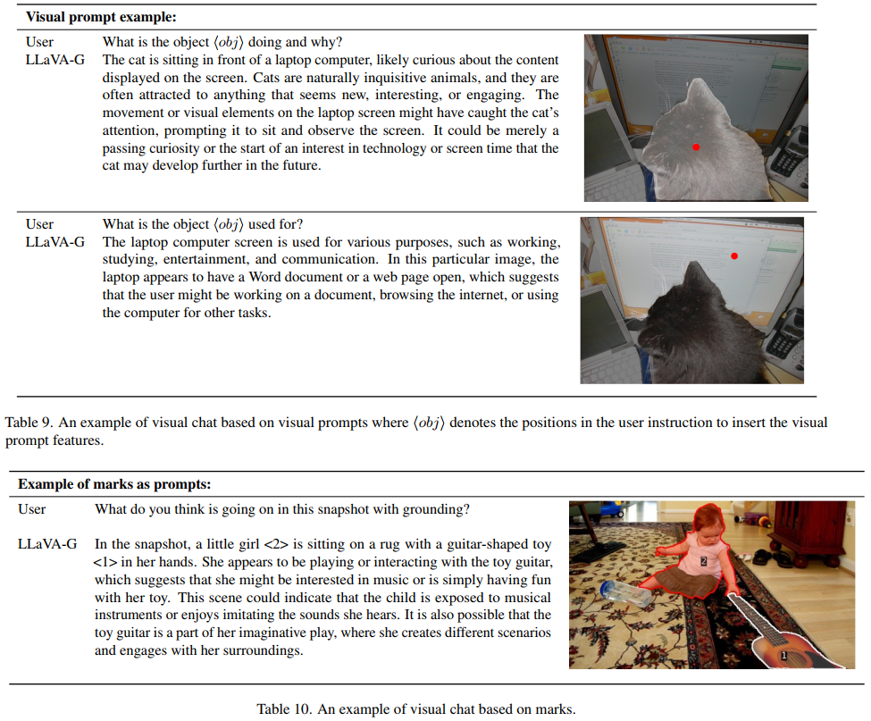 - 支持标记作为视觉提示词(表10):在对标记数据进行微调后,我们的模型有效地支持标记作为可视化提示词。