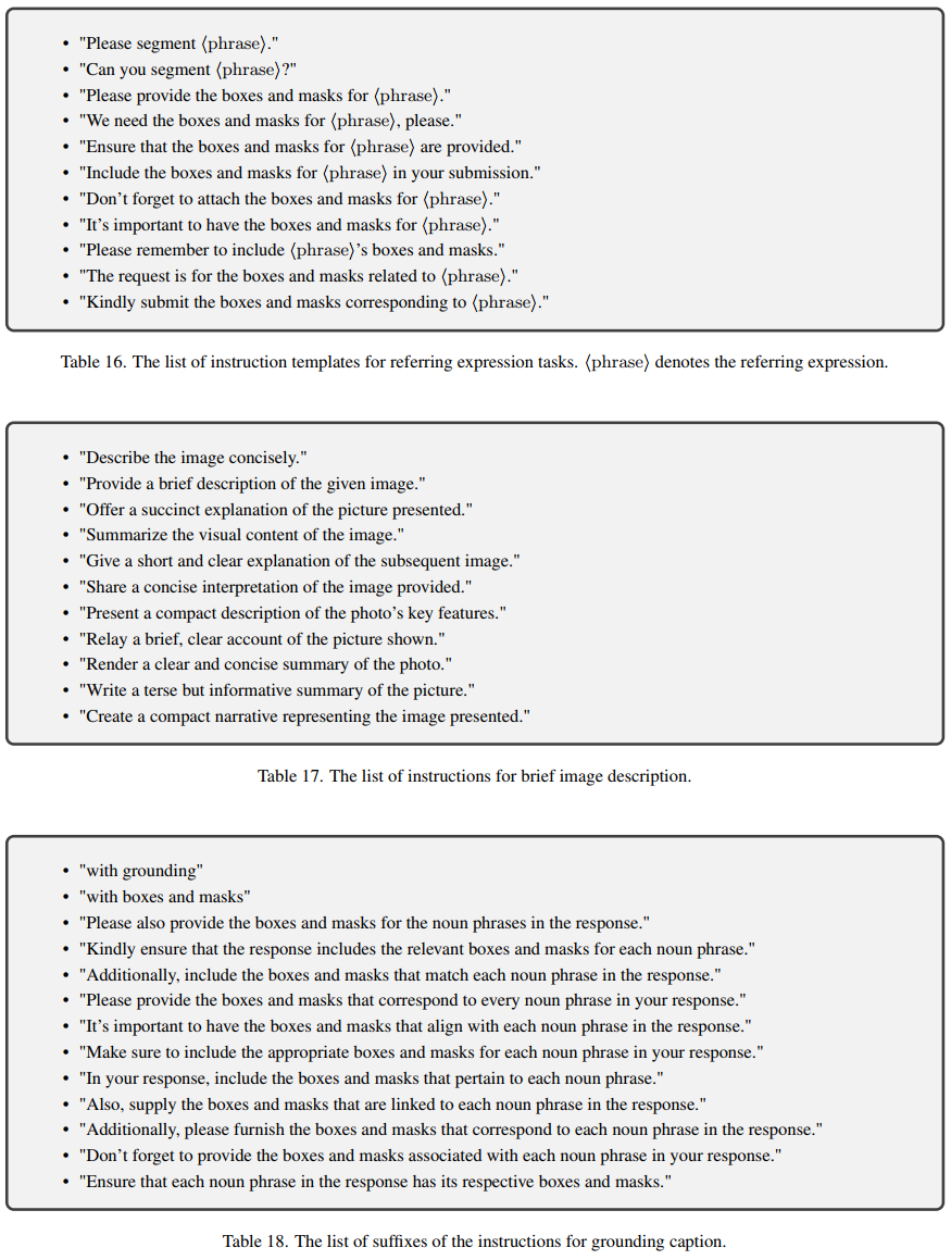 - 相比之下,Flickr30K Entities数据集与前面提到的图像说明文字数据不同。这里,用户指令后面跟着一个从表18中随机选择的后缀。该后缀向模型发出信号,以产生定位格式的响应,如第2.2节所述。然后,通过在Xa中插入特殊token ⟨gs⟩、⟨ge⟩和⟨seg⟩来标记名词短语,将响应Xa转换为定位格式。
