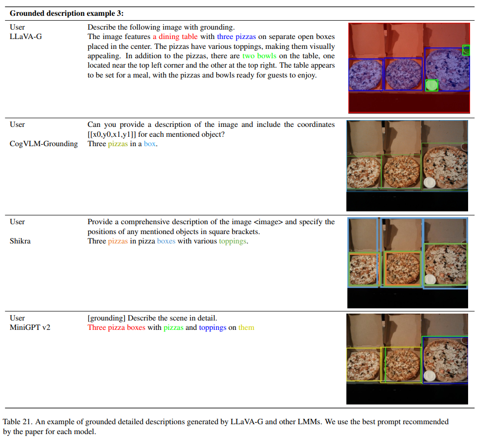 表20和21显示了LLaVA-G和其他定位LMM在定位描述中的更多比较。