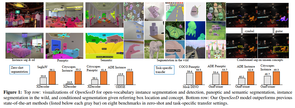 我们介绍了OpenSeeD,这是一个简单的开放词汇分割和检测框架,它可以从不同的分割和检测数据集中联合学习。为了弥补词汇和注释粒度的差距,我们首先引入了一个预训练的文本编码器,对两个任务中的所有视觉概念进行编码,并为它们学习一个公共的语义空间。与仅在分割任务上训练的同行相比,这给了我们相当好的结果。为了进一步调和它们,我们确定了两个差异:i)任务差异——分割需要提取前景目标和背景内容的掩码,而检测只关心前者;ii)数据差异——框和掩码注释具有不同的空间粒度,因此不能直接互换。为了解决这些问题,我们提出了一种解耦解码来减少前景/背景之间的干扰,以及一种条件掩码解码来帮助生成给定框的掩码。为此,我们开发了一个包含所有三种技术的简单编码器-解码器模型,并在COCO和Objects365上对其进行了联合训练。在预训练之后,我们的模型在分割和检测方面都表现出竞争性或更强的零样本可迁移性。具体而言,OpenSeeD在5个数据集的开放词汇实例和全景分割方面击败了最先进的方法,并在类似设置下优于之前在LVIS和ODinW上的开放词汇检测工作。当迁移到特定任务时,我们的模型在COCO和ADE20K上实现了新的SoTA,用于全景分割,在ADE20K和Cityscapes上实现了实例分割(图中的下一行显示了OpenSeeD和以前的SoTA方法的性能比较)。最后,我们注意到,OpenSeeD是第一个探索联合训练在分割和检测方面的潜力的工作,并希望它能被视为在开放世界中为这两项任务开发单一模型的有力基准。代码将在https://github.com/IDEA-Research/OOpenSeeD上发布。