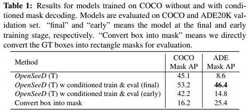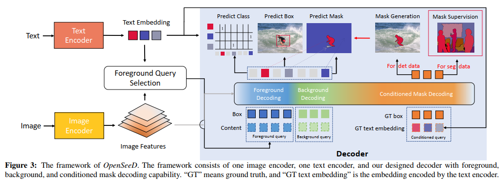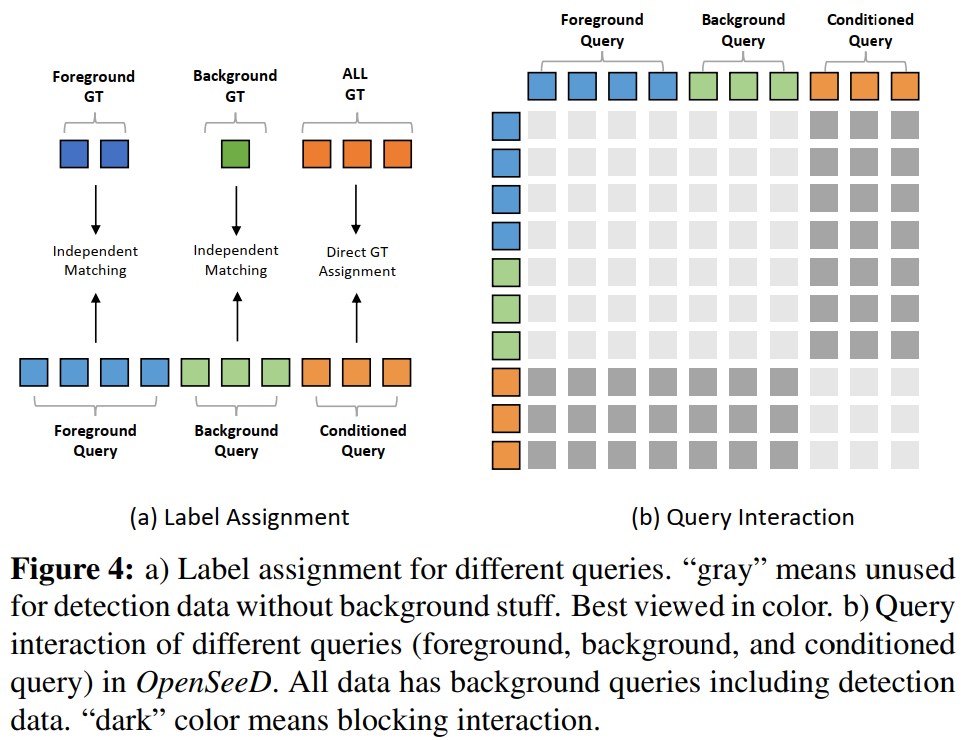 条件掩码解码训练。基于已验证的假设,我们添加所有GT框和标签作为条件查询,以同时学习前景/背景解码和条件掩码解码,如图3所示。它统一了我们所有的任务,使OpenSeeD能够在联合语义空间中学习更广义的条件解码。基于此,我们可以从字面上推导出目标检测数据的伪掩码