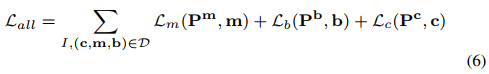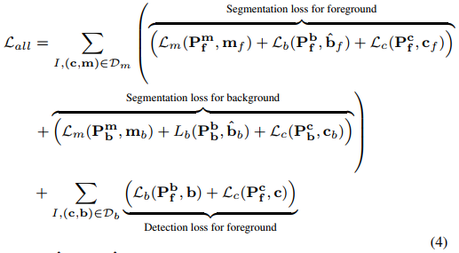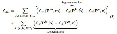为了清楚起见,我们省略了每个损失项的权重。请注意,对于分割任务,我们可以从掩码m导出精确的框