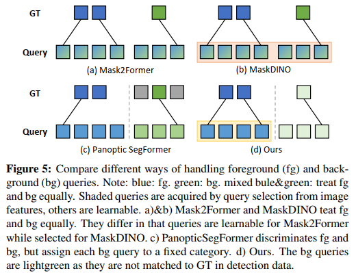 与以往工作的比较。在图5中,我们展示了我们的方法与其他方法在处理前景和背景方面的比较。Mask2Former [5]和MaskDINO [29]在进行全景分割时平等地处理前景和背景,与仅在前景类上训练的相同模型(实例分割)相比,导致前景目标的掩码平均精度(AP)次优。Panoptic Segformer [32]将前景和背景查询分开,但它们的背景查询具有固定的语义,每个查询都对应于预定义的背景类别,这限制了它们处理开放词汇类别的能力。相反,我们的方法通过语言引导的选择机制提出了前景查询,并且我们的背景查询是完全可学习的,消除了预定义词汇的限制。