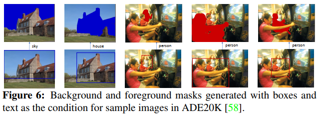 映射假设验证。为了回答这个问题,我们进行了一项试点研究。我们训练一个模型,该模型学习在COCO [4]上解码以GT概念和框为条件的掩码,然后在ADE20K [58]上评估条件解码性能。结果如表1所示。比较前两行,我们可以发现以GT概念和框为条件的掩码解码显著提高了质量(掩码AP从8.6提高到46.4),甚至达到了与COCO相似的水平(46.4 vs. 53.2)。这些结果表明,我们学到的掩码解码可以很好地推广到具有新类别的新数据集。为了进一步验证,我们在图6中可视化解码的掩码。