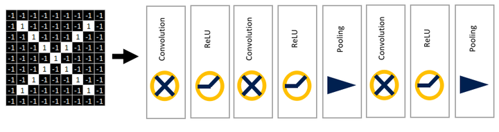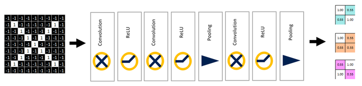 原图片尺寸为9X9,在一系列的卷积、relu、池化操作后,得到尺寸被压缩为2X2的三张特征图。