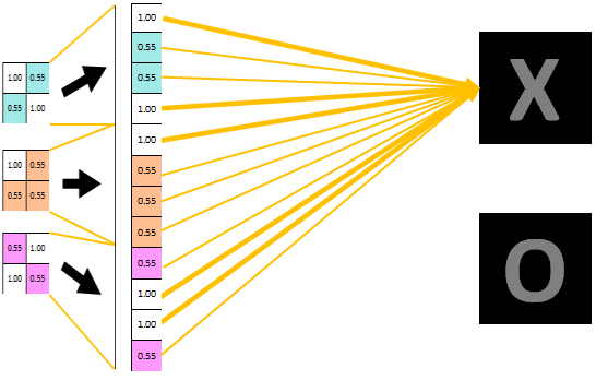 注意:本例中因为只有两个类别X和O,而且数据量到此已经非常少了,因此直接将三个特征图改变维度直接变成一维的数据。(相当于全连接层的每个参数均为1)