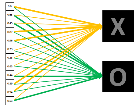 0.9表示极其大可能是X,因此对应到X的黄色线条比对应到O的绿色线条要粗很多很多。
